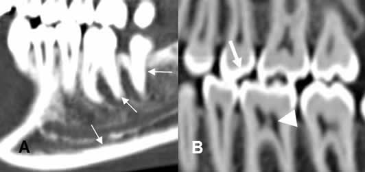 A y B: TAC reconstrucción sagital. Dentina, con similar densidad que la cortical del hueso. (Flechas delgadas). Cemento mas denso, en la corona del diente. (Flecha gruesa). Cámara pulpar y conducto radicular, menos densos. (Punta de flecha).