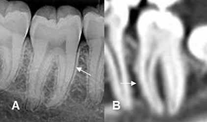 A: Rx periapical y B: TAC reconstrucción sagital. Imagen radiolúcida entre la dentina y la lámina dura, que corresponde al ligamento periodontal. En B, se identifica el espacio periodontal radiolúcido.
