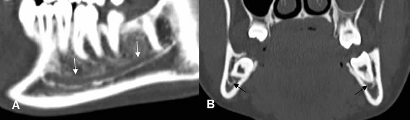 A: TAC reconstrucción sagital y B: TAC reconstrucción coronal. Canal mandibular de bordes densos y que ocupa la parte inferior de la mandíbula.
