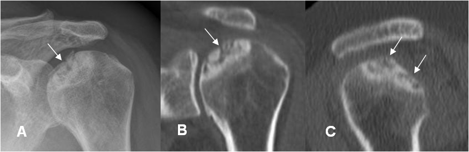 A: Rx AP, B: TAC reconstrucción coronal y C: TAC reconstrucción sagital. Cambios degenerativos en la cabeza humeral, con formación de lesiones osteocondrales.