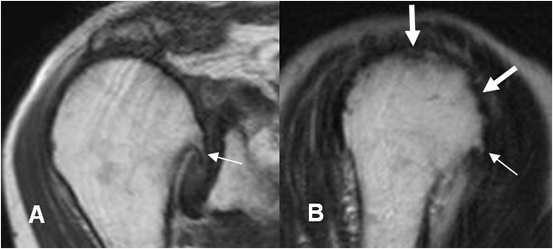 A: RM coronal en T1 y B: RM sagital en T2. Cambios degenerativos con formación de osteofitos (Flechas delgadas) y lesiones osteocondrales. (Flechas gruesas).