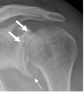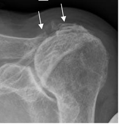 Rx AP de hombro. Osteopenia generalizada. Reabsorción del acromión y el tercio distal de la clavícula, hallazgos típicos de AR.