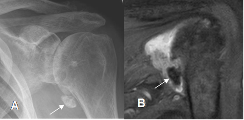 A: Rx AP de hombro: Cambios degenerativos en la articulación glenohumeral. Hay cuerpo libre calcificado. (Flecha).