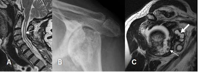 B: Rx AP de hombro. Signos de artropatía degenerativa, con pérdida del espacio articular.
