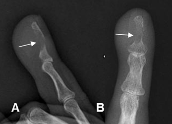 A: Rx lateral y B: Rx AP: Prominencia de los tejidos blandos y lesión lítica en la falange distal, por osteomielitis.