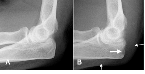 A y B: Rx lateral. Inicialmente no se encuentran alteraciones. Después hay prominencia de los tejidos blandos, con obliteración de los planos grasos. (Flechas delgadas) y área de osteolisis en la parte posterior del olécranon, por osteomielitis. (Flecha gruesa).