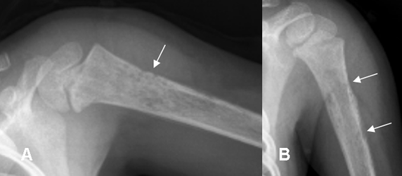 A y B: Rx simple. Prominencia de tejidos blandos, irregularidad en la cortical del húmero y alteración en la densidad del hueso, por osteomielitis.