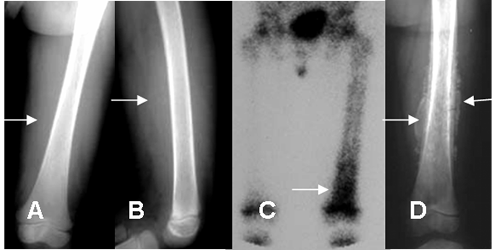 C: Gamagrafía. Depósito anormal del trazador en el fémur distal, por osteomielitis aguda.