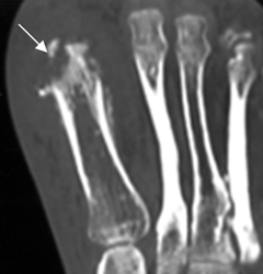 TAC reconstrucción coronal. Edema de tejidos blandos rodeando el hallux, con osteolisis en la parte distal del metatarsiano, por osteomielitis.