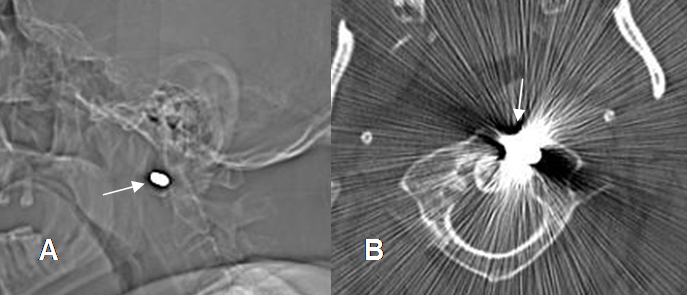A: Rx lateral y B: TAC axial. Herida por arma de fuego, con proyectil localizado hacia el lado izquierdo del arco anterior de C1.