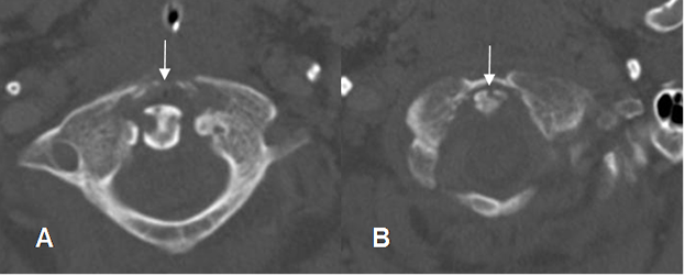 A y B: TAC axial. Igual paciente anterior. La bala ocasiona lesiones en el arco de C1 y la odontoides.