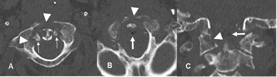 A y B: TAC axial. C: TAC reconstrucción coronal. Igual paciente anterior. Mala evolución clínica, con fiebre y sepsis. En el TAC de control se encuentra osteolisis del arco anterior y el lado derecho de C1 y la odontoides, por osteomielitis. (Puntas de flecha). Hay fragmentos óseos libres dentro del canal. (Flechas delgadas). Adicionalmente existen burbujas de aire dentro del canal, por la formación de absceso. (Flechas gruesas).