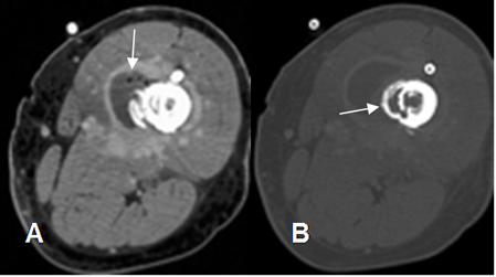 A: TAC axial en ventana de tejido y B: en ventana de hueso. Cambios inflamatorios en los tejidos blandos (Flecha delgada), con orificio de fístula medial. (Flecha gruesa).