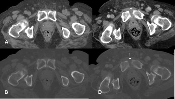 B: TAC axial en ventana de tejido y D: en ventana ósea. Erosión en las corticales del pubis, con cambios inflamatorios en los tejidos blandos, por osteomielitis.