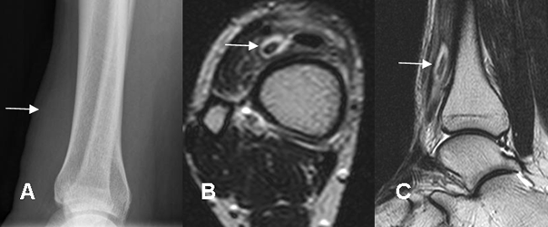 A: Rx lateral. Prominencia de los tejidos blandos de la pierna, sin alteraciones óseas.