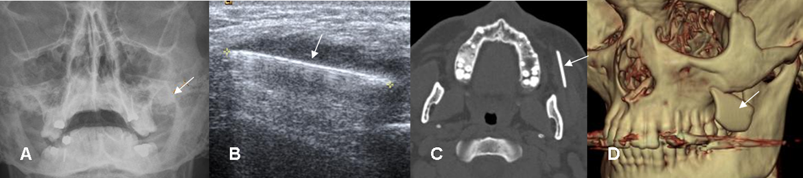 A: Rx AP. Imagen lineal y densa en la región malar izquierda.