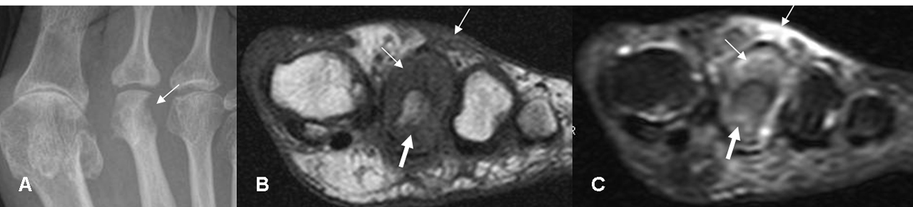 B: RM axial en T1 y C: RM axial en STIR. Cambios inflamatorios en el tejido celular subcutáneo y rodeando la cabeza del metatarsiano. (Flechas delgadas). El hueso muestra erosión en su parte posterior y edema trabecular, por osteomielitis. (Flechas gruesas).