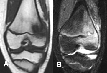 A: RM coronal en T1 y B: RM coronal en STIR. Edema óseo en la región metafiso-epifisiaria distal del fémur, con cambios inflamatorios en los tejidos blandos, por osteomielitis.