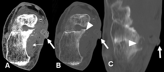 C: TAC reconstrucción coronal. Erosión del calcáneo, por osteomielitis. (Punta de flecha).
