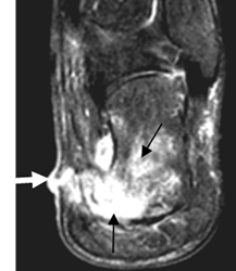 RM coronal en STIR. Osteolisis del calcáneo, con cambios inflamatorios en los tejidos blandos. (Flechas negras). Se identifica trayecto de fístula hiperintensa, hacia la parte interna del pie. (Flecha gruesa).
