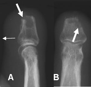 A: Rx lateral y B: Rx AP. Amputación traumática de la falange media en el 3 dedo. Por persistencia del dolor se toma Rx encontrando gran edema de tejidos blandos (Flechas delgadas), irregularidad de los bordes óseos y área de osteolisis, por osteomielitis. (Flecha gruesa).
