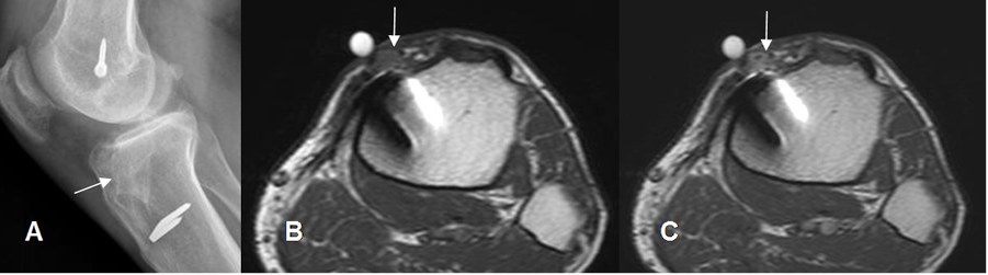 B: RM axial en T1 simple y C: RM axial en T1 con contraste. Marca en el orificio de supuración, encontrando cambios inflamatorios en los tejidos blandos que realzan con el contraste, en relación con la grapa metálica.
