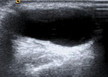 Ecografía sagital. Lesión de consistencia líquida en el dorso de la muñeca, por ganglión quístico.