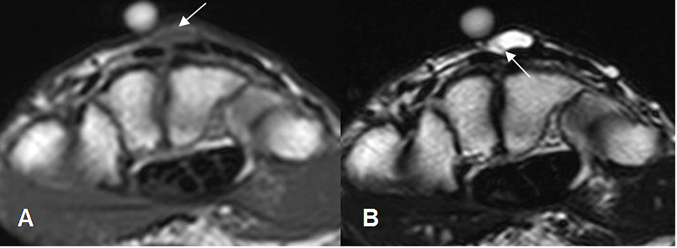 A: RM axial en T1 y B: RM axial en T2. Lesión isointensa en T1 e hiperintensa en T2 en el dorso del carpo, por ganglión quístico. Se observa septo delgado en T2. (Flecha).