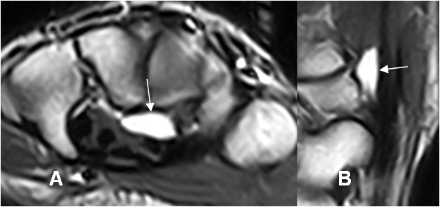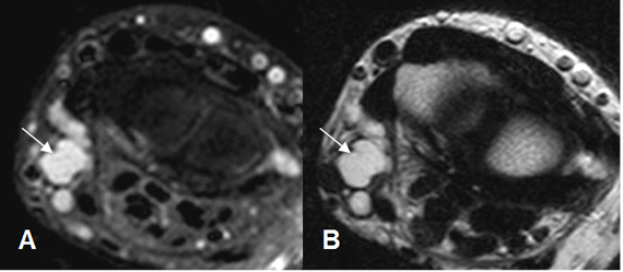 A: RM axial en T2 y B: RM axial en STIR. Lesión quística en la parte medial de la muñeca, que corresponde a ganglión quístico.