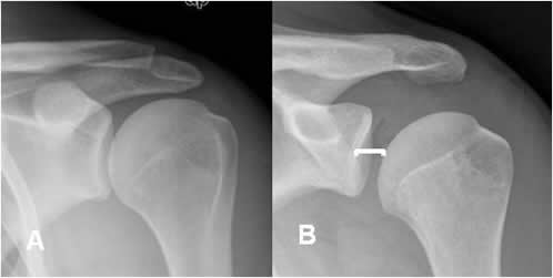 B: Rx AP. Aumento del espacio glenohumeral, por luxación posterior.