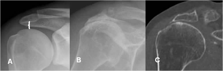 B: Rx AP y C: TAC reconstrucción coronal. Cambios degenerativos con pérdida del espacio acromiohumeral y esclerosis asociada, por ruptura crónica del supraespinoso.