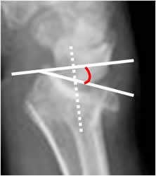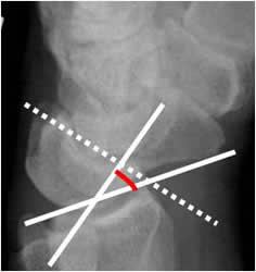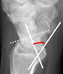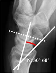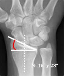 Se traza con una línea perpendicular al eje del radio y otra línea a lo largo de su superficie distal. El valor normal es entre 16º y 28º. (12). Este ángulo disminuye en fracturas metafisisarias, impactadas, de Colles y Smith. Debe ser valorado después de la reducción e inmovilización, para dejarlo lo mas normal posible y que permita una adecuada movilidad. (1). (Fig 46).