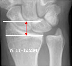 Rx AP. Distancia entre las líneas que pasan por el extremo de la apófisis estiloides del radio y la superficie articular.