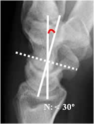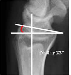 Trazado en la Rx lateral. Angulo formado entre la perpendicular al eje del radio y una línea que une su extremo anterior y posterior. El valor normal es entre 0 y 22º (12). Cualquier valor negativo es patológico. (13). (Fig 49 y 50).