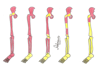 Al nacimiento (Izquierda), casi toda la MO es roja y se convierte a MO amarilla progresivamente, de distal a proximal.