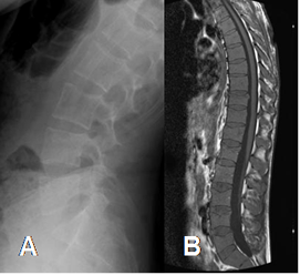 A: RX lateral de columna. Signos de osteopenia generalizada.