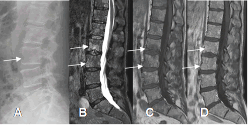A: Rx lateral de columna. Pérdida de la cortical anterior de L3.