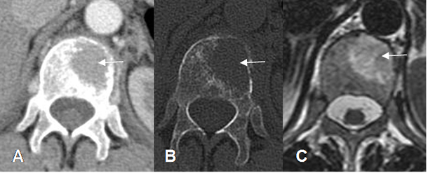 C: RM axial en T2. La misma lesión hiperintensa en el cuerpo de D12.