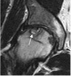 RM coronal en T2. Signo de la doble línea hiperintensa en T2, típico de la osteonecrosis.