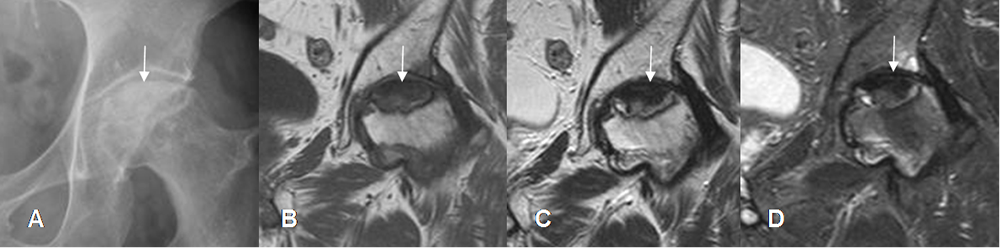 A: Rx AP. Aumento en la densidad y pérdida de la morfología de la cabeza femoral.