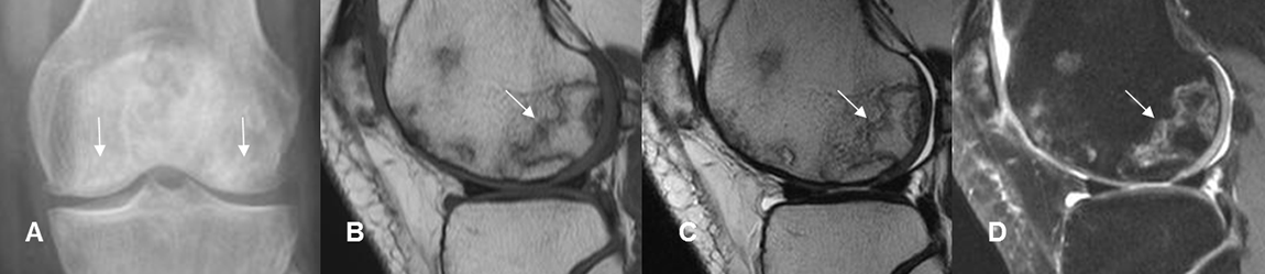 B: RM sagital en T1, C: RM sagital en T2 y D: RM sagital en STIR. Lesión geográfica en la parte posterior del cóndilo femoral lateral, hipointensa en T1 y T2 e hiperintensa en STIR, por osteonecrosis de evolución subaguda. Adicionalmente hay lesiones osteocondrales en la patela y la parte anterior del cóndilo.