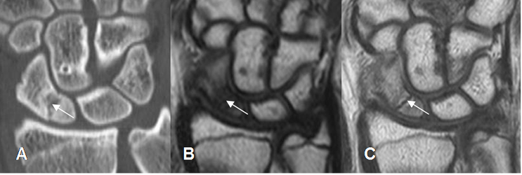 B: RM coronal en T1. El polo inferior del escafoides es mas hipointenso, lo que hace sospecha osteonecrosis.