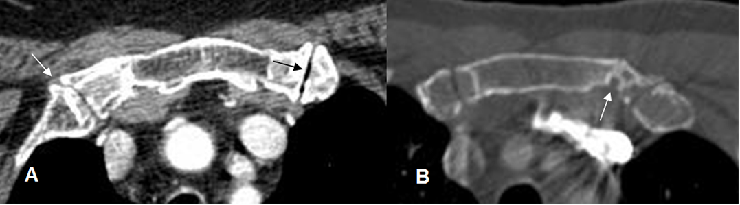 A: TAC axial. Pérdida del espacio articular y formación de osteofitos en articulaciones costoesternales, por artropatía degenerativa. En el lado izquierdo se aprecia fenómeno del vacío.