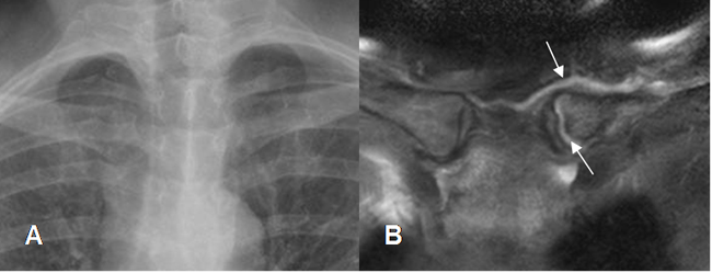B: RM coronal en STIR. Escaso líquido dentro y rodeando la articulación esternoclavicular, por cambios degenerativos incipientes.