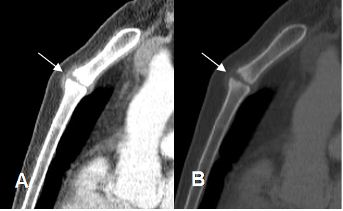 A: TAC reconstrucción sagital en ventana de tejido y B: en ventana de hueso. Esclerosis en los bordes sobre el ángulo de Louis, con prominencia de los tejidos blandos, por proceso degenerativo.