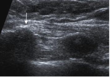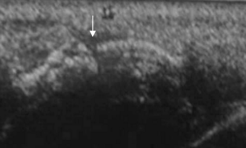 Ecografía. Lado izquierdo normal. En el lado derecho hay prominencia de la articulación condroesternal, con formación de osteofitos (Flecha), por cambios degenerativos.