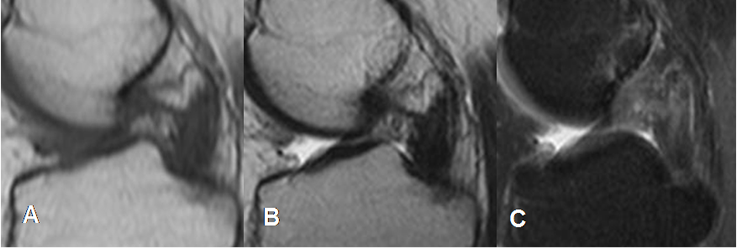 A: RM sagital en T1, B: RM sagital en T2 y C: RM sagital en STIR. Ausencia del LCP sin cambios inflamatorios agudos, por ruptura de evolución crónica.
