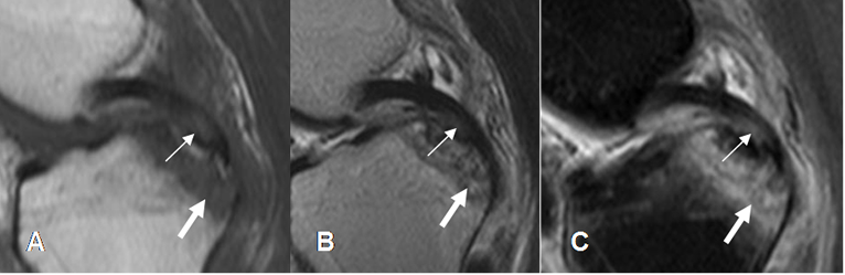 A: RM sagital en T1, B: RM sagital en T2 y C: RM sagital en STIR. Zona de aumento en la señal en el tercio distal del LCP, con ruptura de algunas fibras por esguince GII. (Flecha delgada). Además hay contusión en la parte posterior de La tibia. (Flecha gruesa).