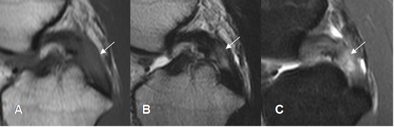 A: RM sagital en T1, B: RM sagital en T2 y C: RM coronal en STIR. Engrosamiento del LCP, por fibrosis reparativa. Existe zona hiperintensa en T2 y STIR, por reagudización.
