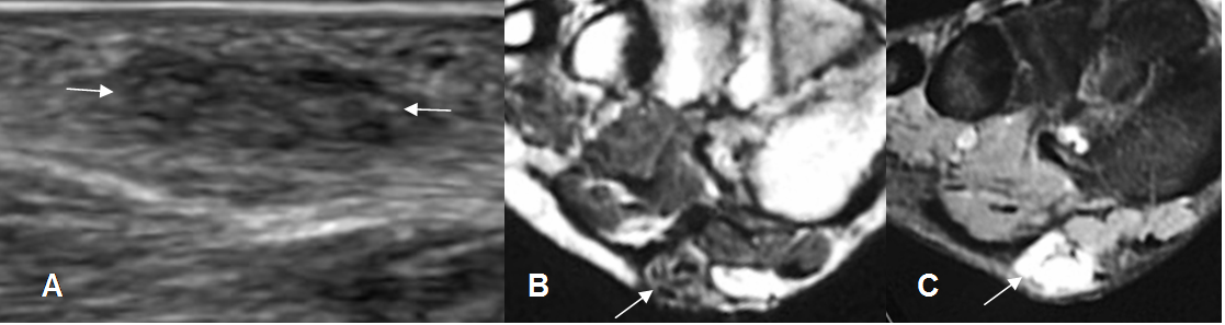 En casos de lesión agresiva, hay compromiso del tejido subcutáneo, músculo o hueso y los nódulos pueden ser hiperintensos en T2 y STIR. (20).
